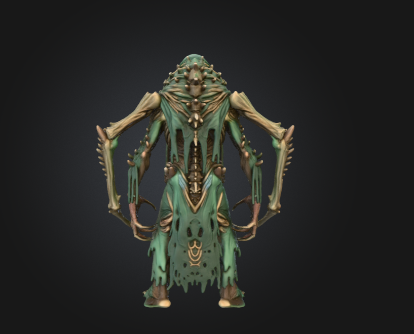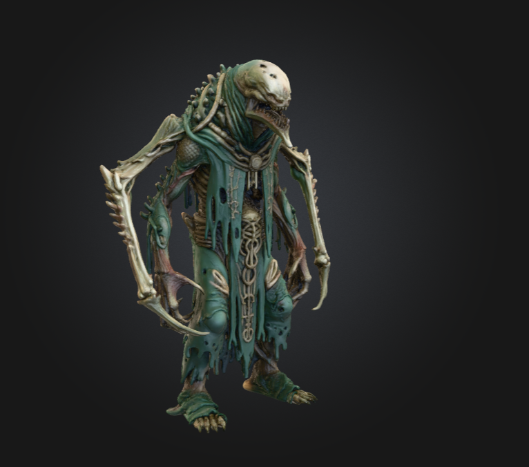 Its elongated skeletal arms, bound with twisted bone growths, stretch outward like ritual totems—both weapons and symbols of its dominion. Each limb is fused with carved bone fragments and decayed organic matter, creating a silhouette both ceremonial and grotesque. The creature’s head, a distorted skull with a predatory jaw, sits beneath layered, decaying hoods and fabric that appear ancient and ritual-worn.