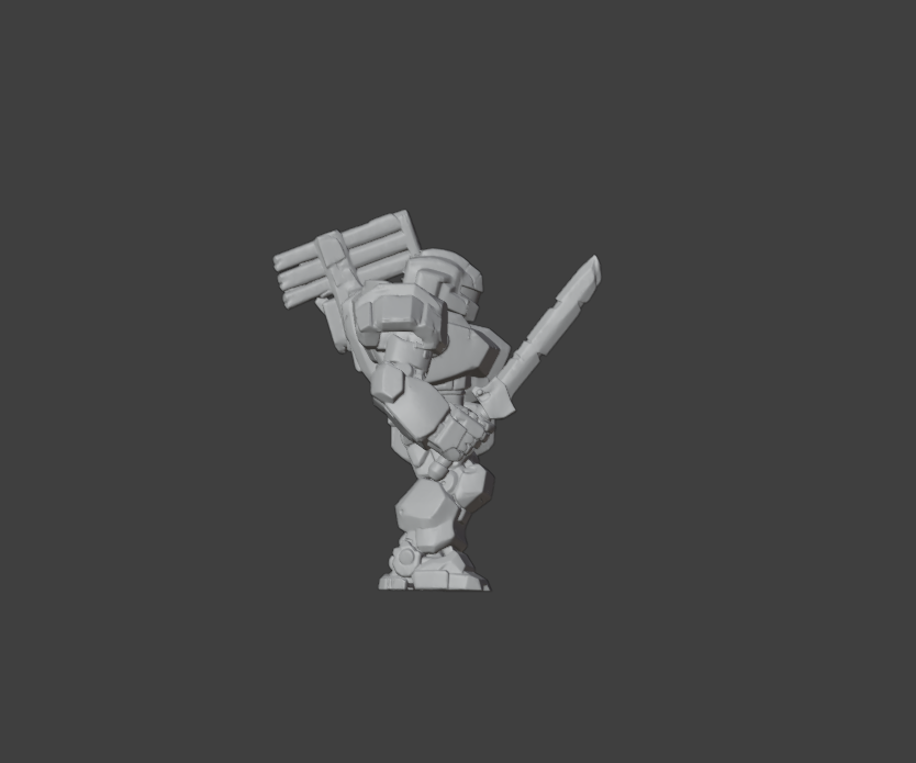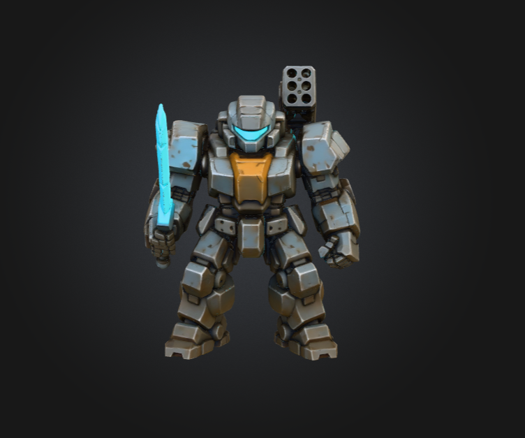 Equipped with a high-intensity energy blade, the mech excels in close-quarters combat, delivering fast and precise melee strikes. The glowing weapon contrasts with the mech’s weathered metal body, enhancing visual impact in both dark and bright environments. Mounted on its back is a multi-barrel missile launcher, adding long-range firepower for versatile combat roles. These dual-purpose armaments allow the Guardian Mech to function as both an assault unit and a protective sentinel.